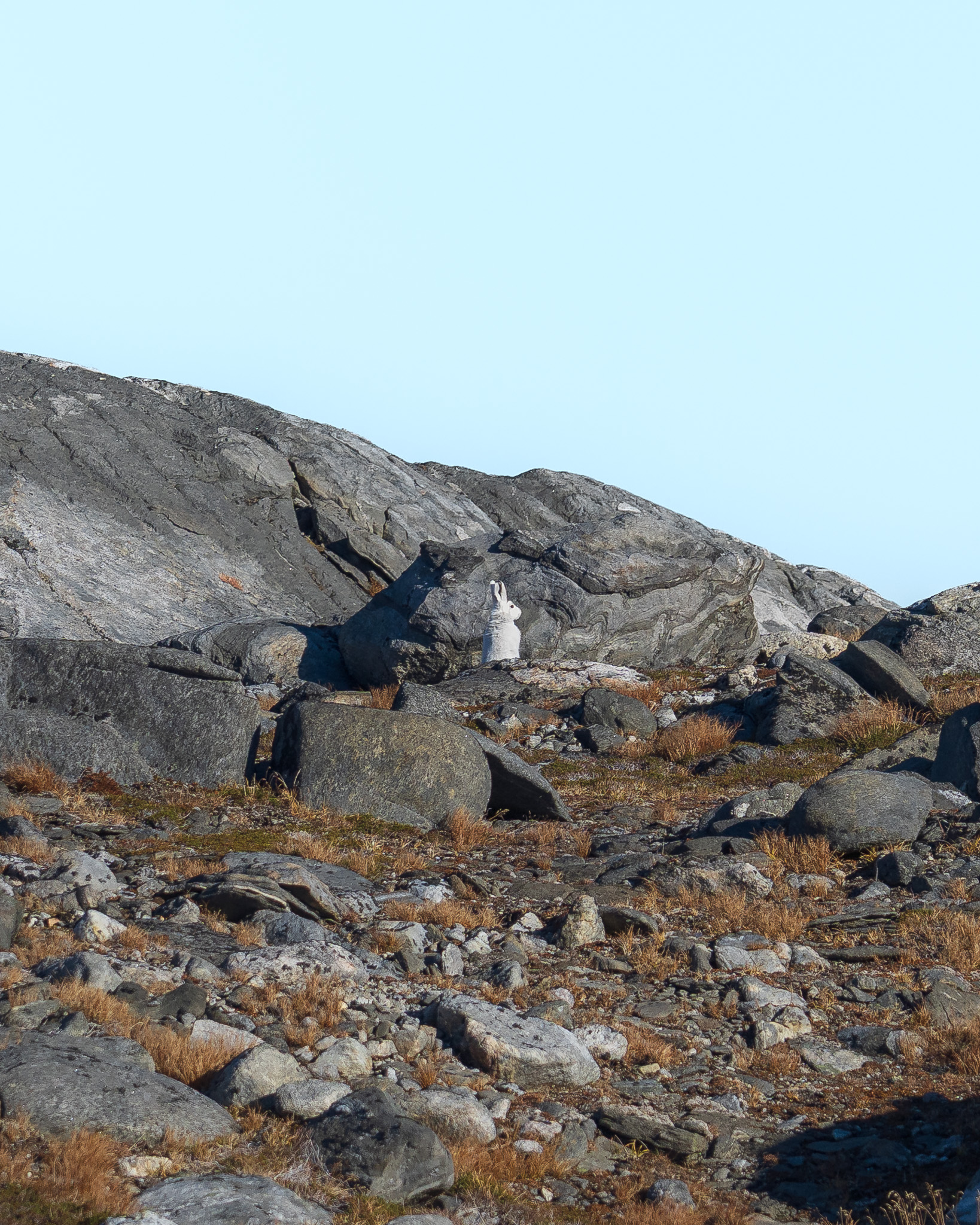 På et plateau tog jeg kameraet frem, og timingen kunne ikke have været mere perfekt. For ud af det blå hoppede en snehare frem mellem klipperne. Jeg fik taget nogle billeder på afstand, men ærgrede mig et øjeblik over ikke at have bragt min 100-400 mm-linse med. Lidt FOMO rammes man vel alle af.
